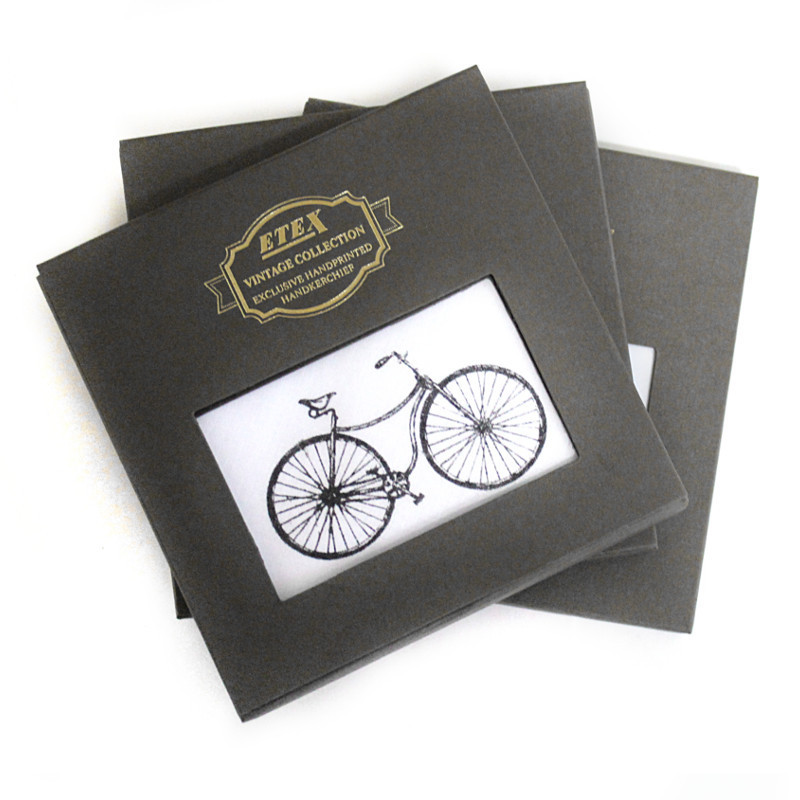 Luxusní pánský kapesník z kolekce Vintage s exkluzivním ručním tiskem historického bicyklu v dárkové krabičce. Každý látkový kapesník je ručně tištěný a je tedy originál. Díky použitému motivu je látkový kapesník ideálním dárkem, který potěší každého automobilového nadšence.