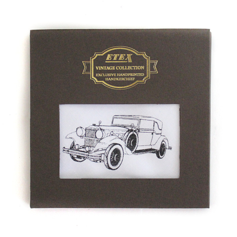 Luxusní pánský kapesník z kolekce Vintage s exkluzivním ručním tiskem historického automobilu v dárkové krabičce. Každý látkový kapesník je ručně tištěný a je tedy originál. Díky použitému motivu je látkový kapesník ideálním dárkem, který potěší každého automobilového nadšence.