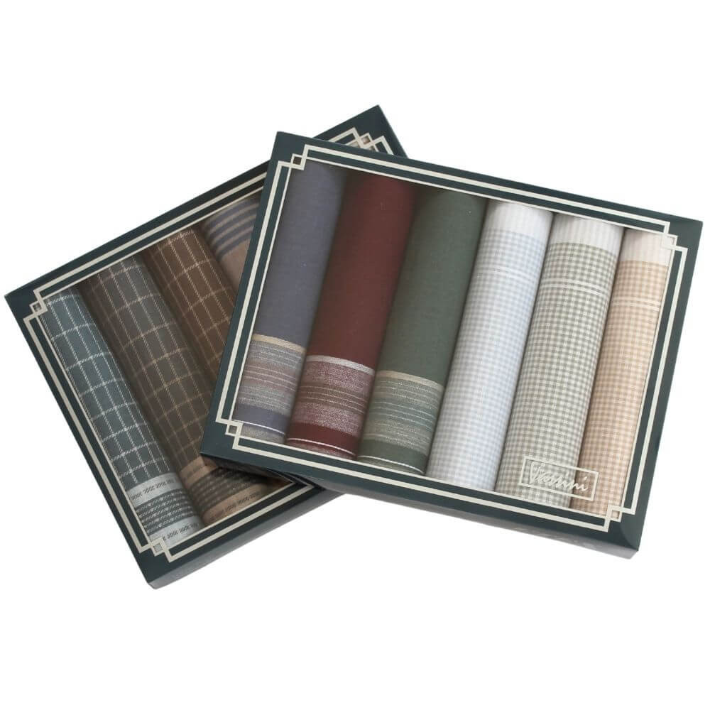 Sada 6 kusů pánských 100% bavlněných kapesníků od českého výrobce je vkusně složena v praktické krabičce s průhledným víčkem. Set kapesníků je krásně barevně nakombinovaný.