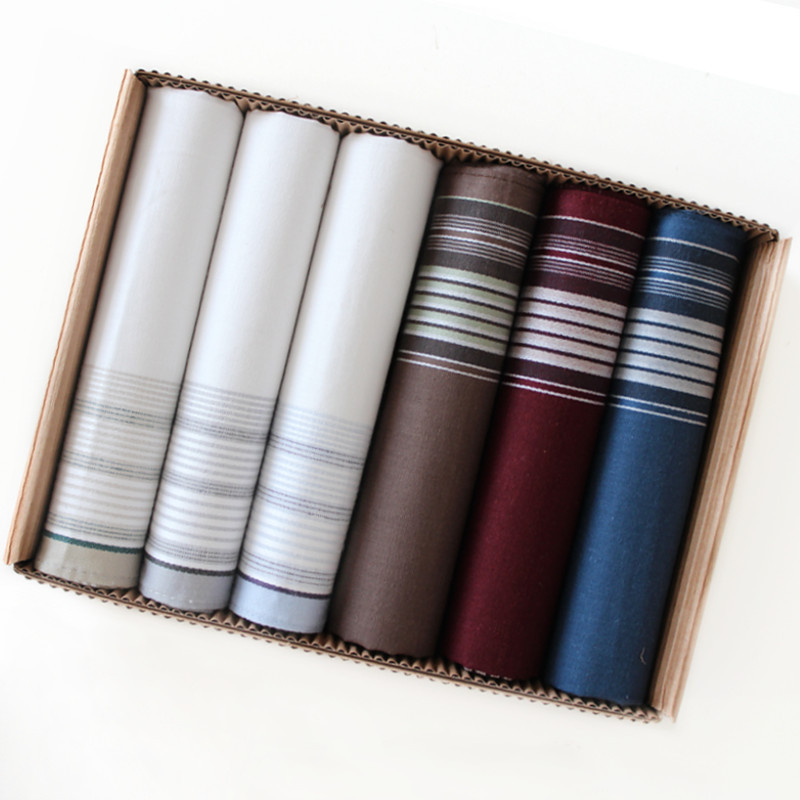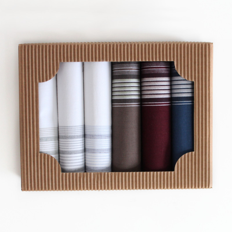 Bavlněné pánské kapesníky, ručně složené v praktické ekologické krabičce s průhledným víkem, jsou v sadě po šesti kusech.