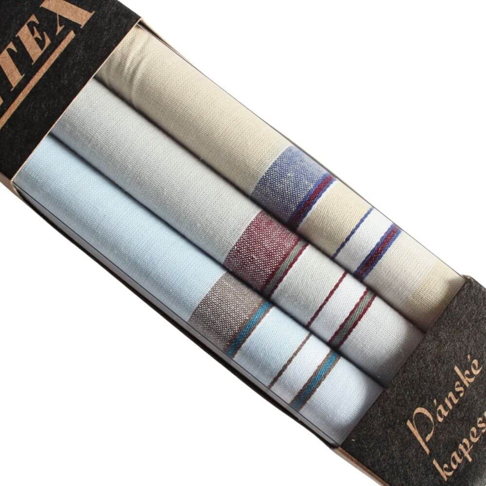 Oblíbené pánské látkové kapesníky jsou uloženy v útlé decentní krabičce s průhledem. Bavlněné kapesníky jsou v sadě 3 kusů ve světlých odstínech s decentními barevnými pruhy po obvodu.