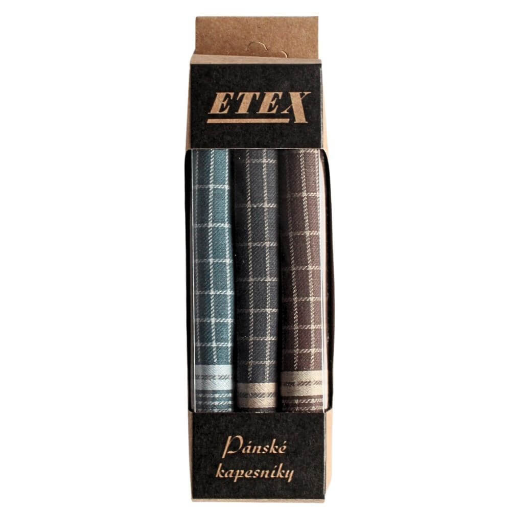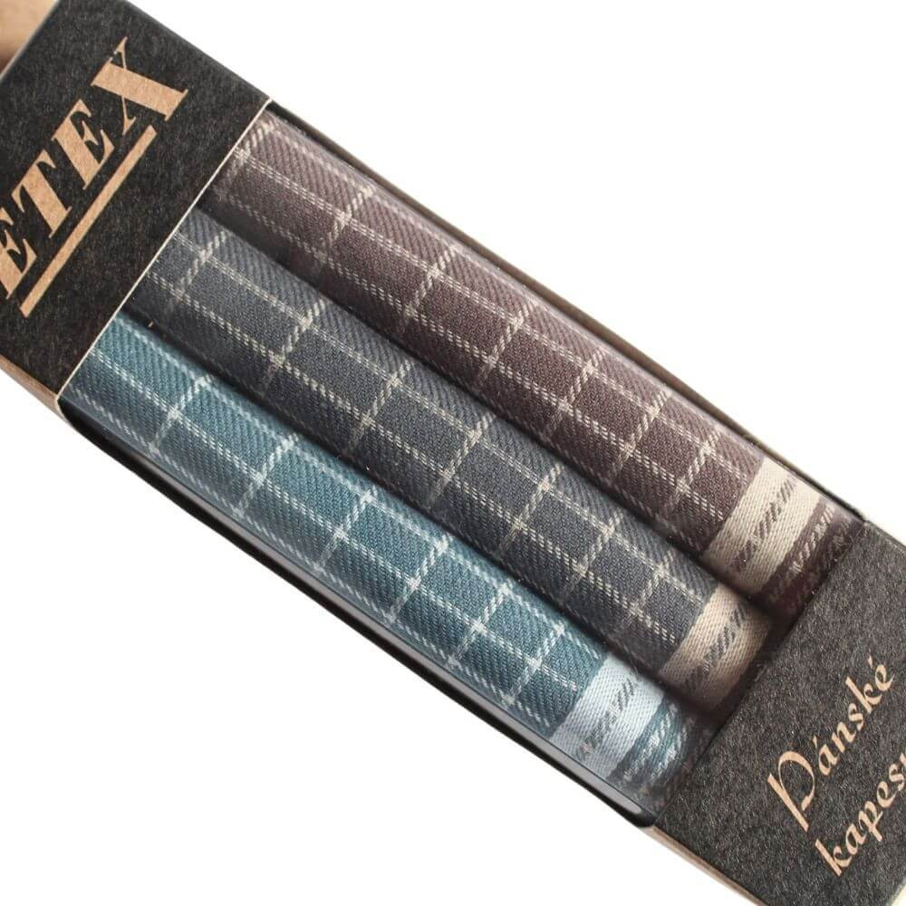 Oblíbené pánské látkové kapesníky jsou uloženy v útlé decentní krabičce s průhledem. Bavlněné kapesníky jsou v sadě 3 kusů v tmavých odstínech s decentním károvaným vzorem. Pánské látkové kapesníky vynikají vysokou kvalitou a tradičním zpracováním. 100% bavlněné měkké kapesníky ocení a upotřebí každý gentleman a je jedno, zda tráví den v kanceláři, za volantem nebo třeba v ordinaci či na stavbě.
