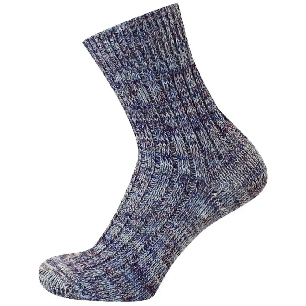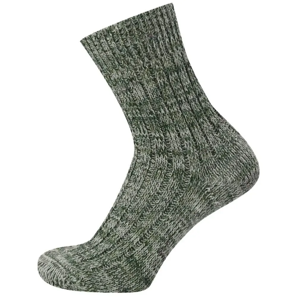 Silné ponožky z vlny mají žebrový vzorek a nohu neškrtící lem. Vhodné na celoroční nošení do běžné nebo i sportovní obuvi, často jsou však nošené i jako pracovní ponožky. Tyto jemně melírované ponožky jsou k dostání ve dvojím barevném provedení: tmavě hnědé nebo tmavě zelenkavé. V kombinaci s měkkou bavlnou jsou ponožky nejen příjemné a pohodlné, ale přinášejí i snadnější údržbu, neboť díky akrylu a polyesteru rychle schnou a netvoří žmolky.